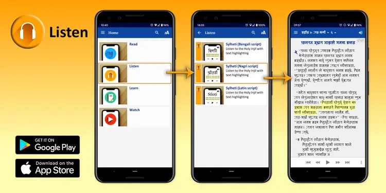 'সিলেটি ভাষায় আসমানী কিতাব' অউ app থাকি, Android আর iOS device দিয়া আপনে পবিত্র তৌরাত শরীফ আর পবিত্র ইঞ্জিল শরীফ ডাউনলোড করিয়া হুনতা পারবা।